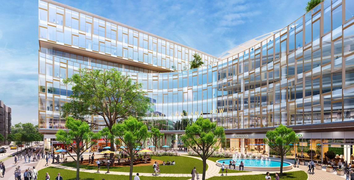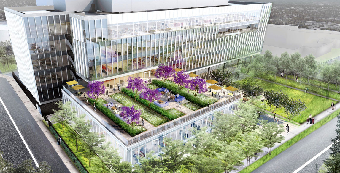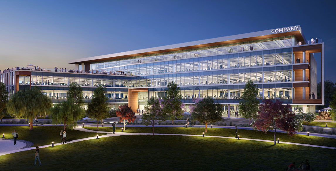 A LEED Platinum 5-story at-grade office building with a roof deck, outdoor courtyard, an adjacent 2-1/2 acre park, a 5-story modern luxury hotel, and a 6-tier parking structure.